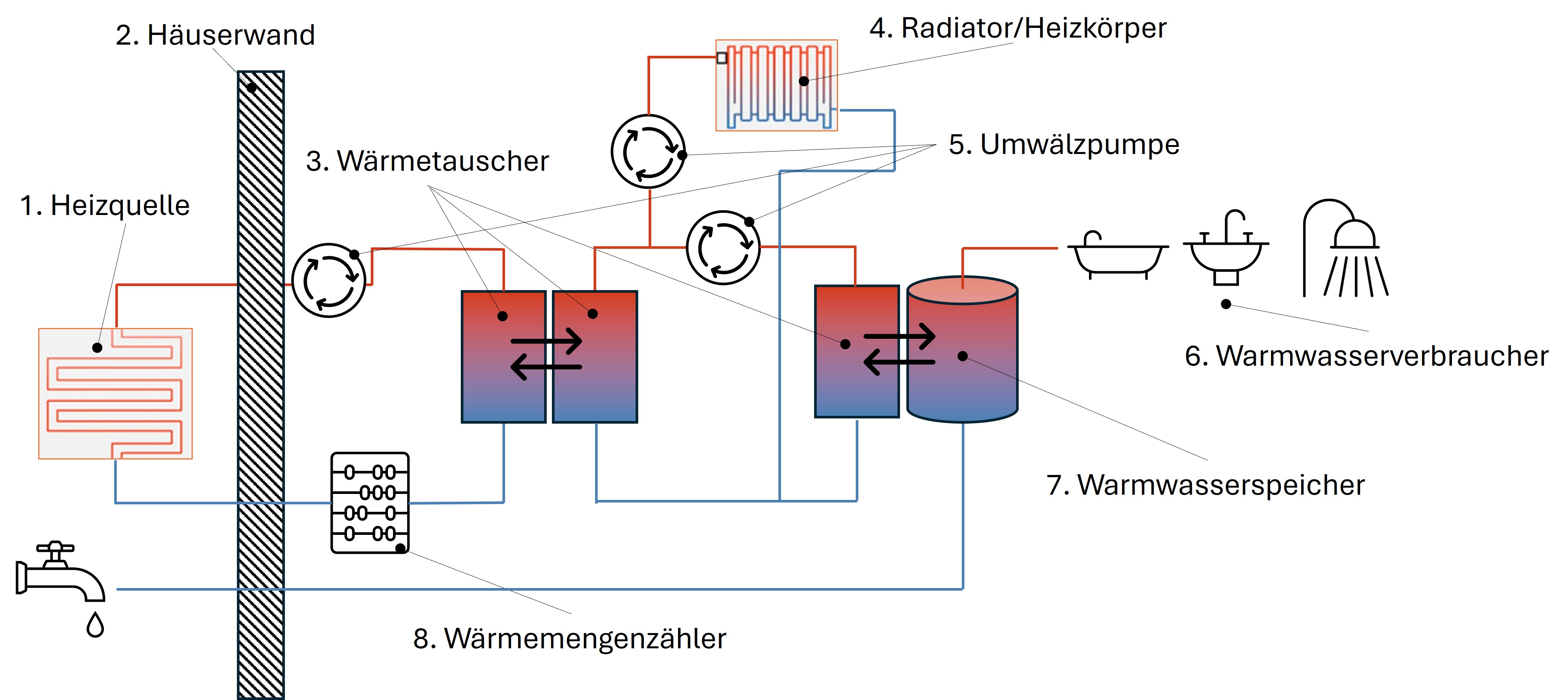 Im Schaubild die Erklärung des Kreislaufes bei Verwendung von Wärmetauschern. Über die Heizquelle (1.) zuvor der Heizkessel wird zentral warmes Wasser erzeugt. Es gelangt durch die Häuserwand (2.) mittels Rohre in die Wohnung. Innerhalb der Wohnung befindet sich der (Platten-) Wärmetauscher (3.). Dieser überträgt die Wärme an einen geschlossenen Wärmekreislauf innerhalb der Wohnung. Dieser Wärmekreislauf versorgt zum einen die Heizkörper (4.). Zum anderen heizt dieser auch das warme Wasser für die Warmwasserverbraucher (6.). Aus 2 Gründen wird ein Warmwasserspeicher (7.) eingesetzt. Erstens um elektrische Energie zu sparen, sonst müssten die Umwälzpumpen (5.) ständig laufen. Zweitens möchte man Verzögerungen so gering wie möglich halten, wenn warmes Wasser bei den Warmwasserverbrauchern benötigt wird.